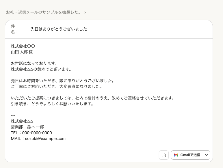 テンプレートのコピペで送るアポイントメールは、相手にも「量産型」であることが伝わります。AIに訪問先の業種・課題・関心事を伝えた上で「この企業に刺さるアポイントメールを書いて」と指示すると、相手ごとにカスタマイズされた文面がすぐに出てきます。