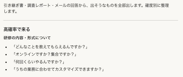 商談中に想定外の質問が来て詰まった経験は、誰にでもあるはずです。AIに「この商品について、顧客から聞かれそうな質問を10個出して」と指示すれば、事前にトークの準備ができます。