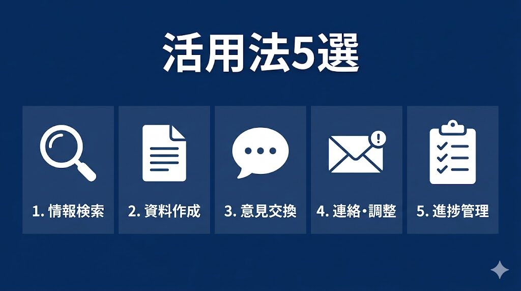 - 企業リサーチ・提案書作成・想定質問準備・メール作成・商談振り返りの5つは、今日からAIで実践できる