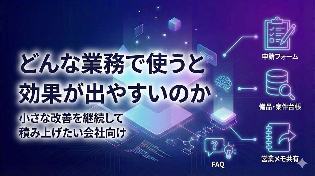 たとえば、申請の簡易フォーム、備品・案件の台帳、問い合わせ削減のためのFAQ、営業のメモ共有など。