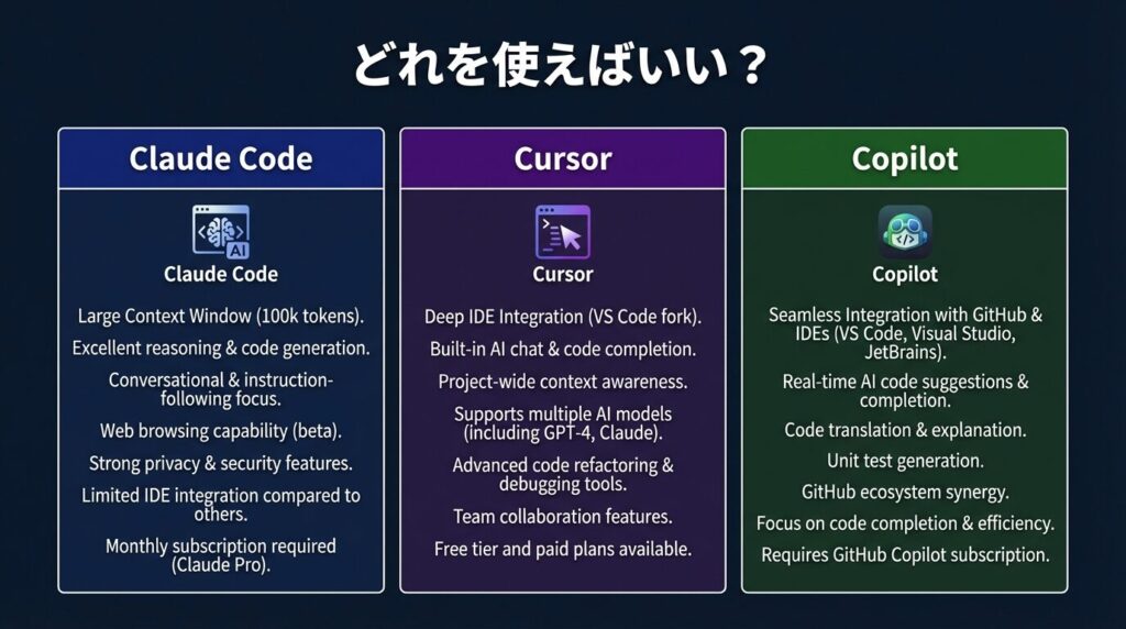 「結局、CursorやGitHub Copilotと何が違うの?」という疑問は自然です。