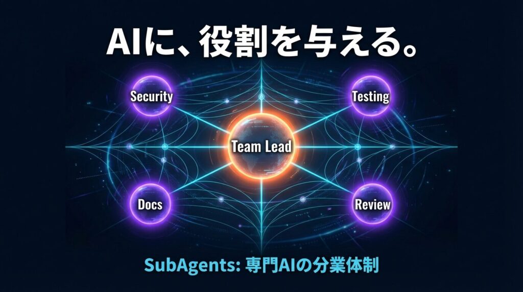 「SubAgents(サブエージェント)」は、AI同士の役割分担を可能にする機能です。「セキュリティ担当のAI」「テスト担当のAI」「ドキュメント担当のAI」を事前に定義しておき、必要に応じて呼び出せます。詳しくは第3章で説明します。