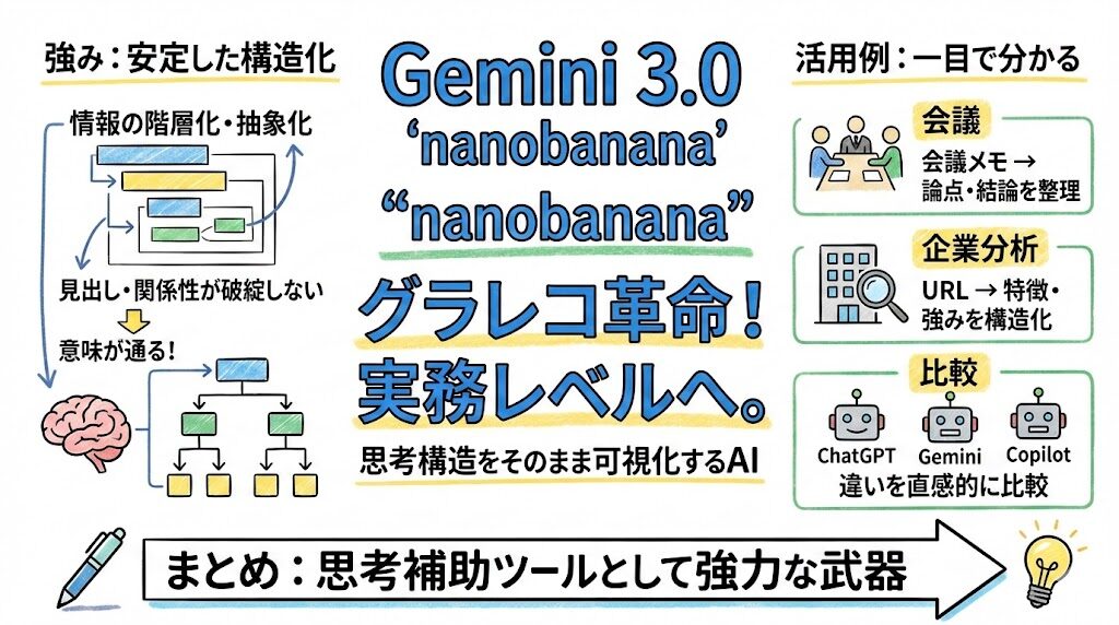 nanobananaの強みは、情報の階層化と抽象化が安定している点です。