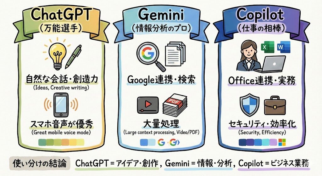 文章生成、検索統合、業務連携といった思想や主戦場の違いが視覚的に整理されるため、