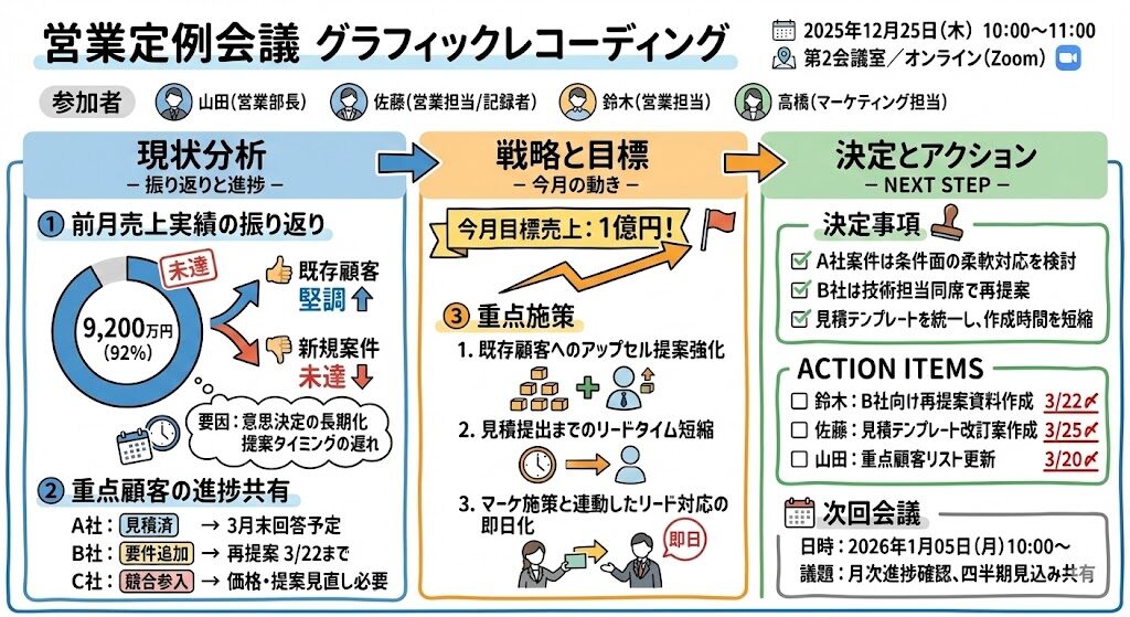 会議の議事メモや要点を渡すだけで、論点・結論・未決事項を一枚のグラレコに整理できます。