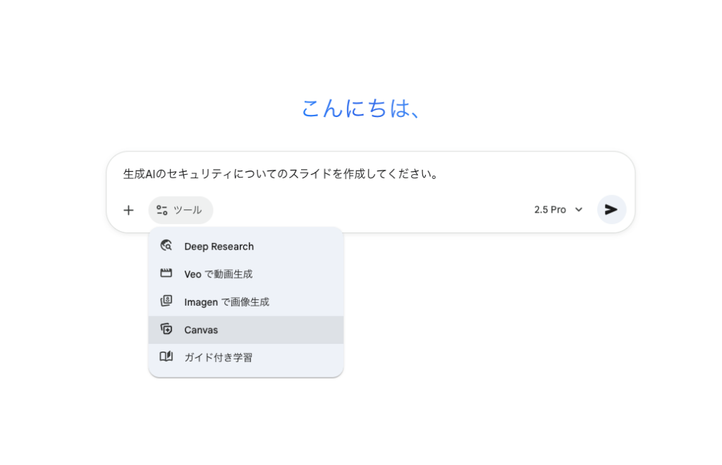 では、実際にGemini AIにスライド作成を依頼する手順を見ていきましょう。非常にシンプルです。