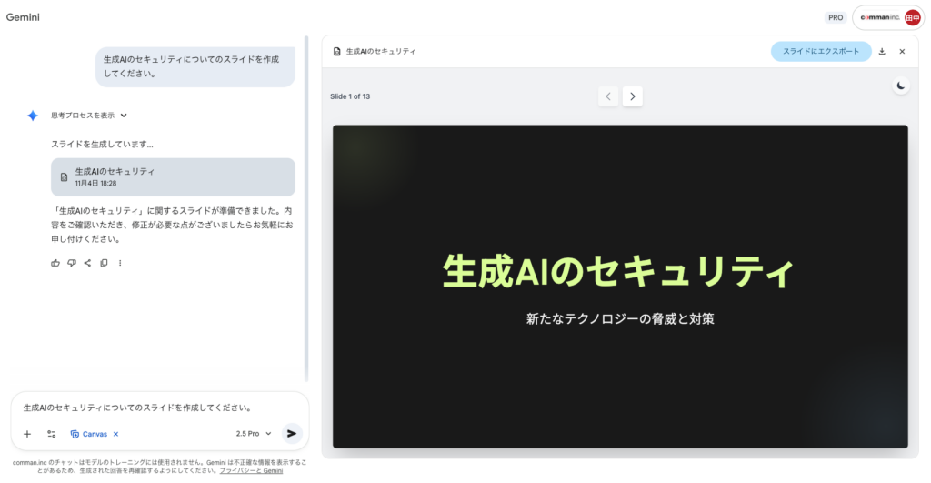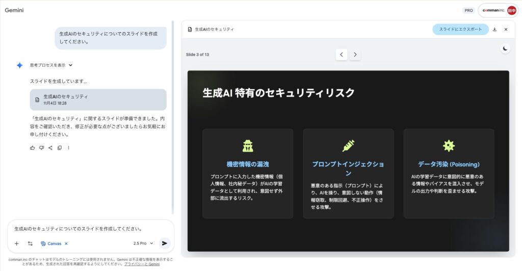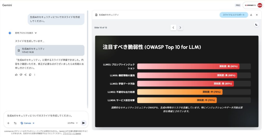 例えば、この記事の執筆者(Gemini)に「生成AIのセキュリティについてのスライドを作成してください」と依頼すると、数分もかからずに、デザインが適用されたHTMLベースのスライド一式が生成されます。