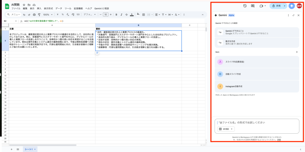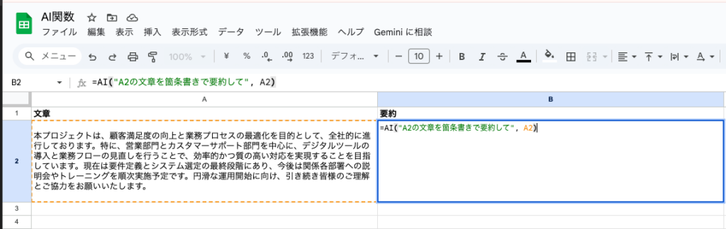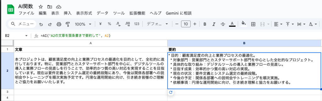 たったこれだけで、B2セルにA2の文章の要約が自動で表示されます。VLOOKUPやQUERY関数のように、AIを関数として扱えるようになったのです。