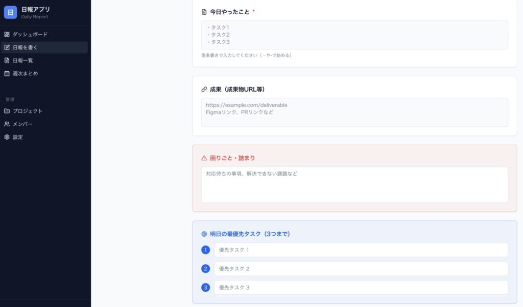 - 日報入力項目(今日やったこと、成果、困りごと、明日の最優先3つ)