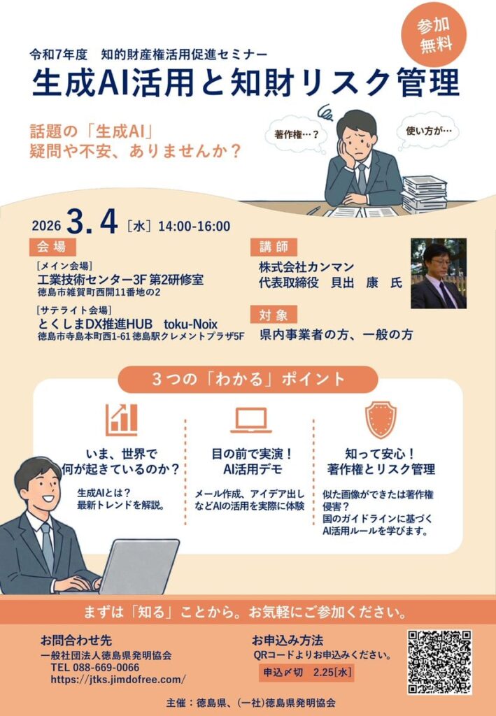 徳島県および一般社団法人徳島県発明協会主催の令和7年度 知的財産権活用促進セミナー「生成AI活用と知財リスク管理」に、弊社代表取締役・貝出康が講師として登壇いたします。