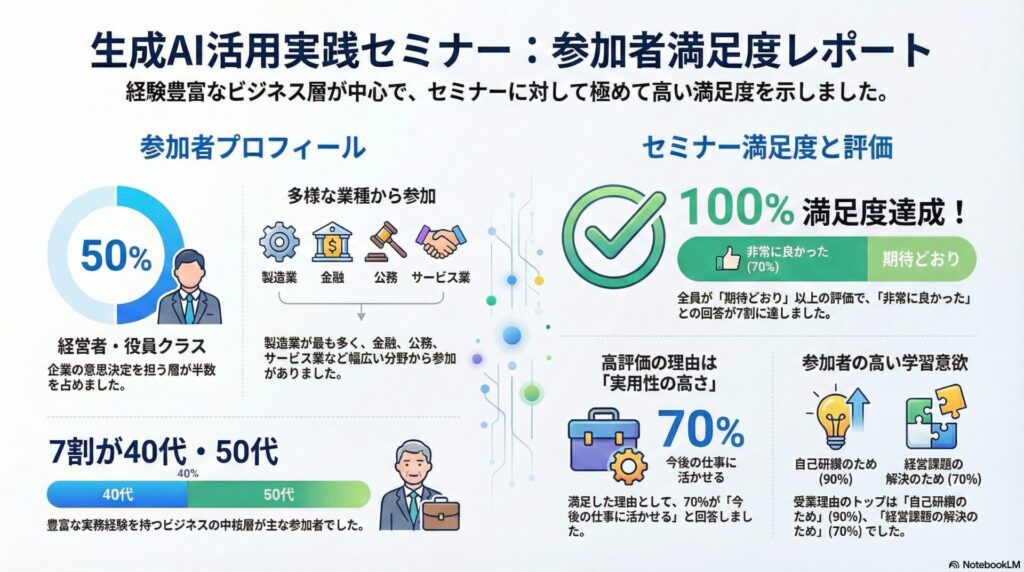 セミナー終了後にも、参加者の皆様から個人的に質問をいくつかいただき、「AIの使い方のイメージが劇的に変わった」「自社での活用の第一歩が見えた」といった前向きなご感想を多数いただきました。